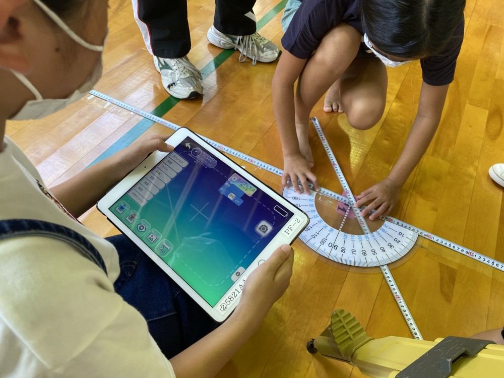 飛行ルート決め、ドローンを飛行させる距離、高さ、角度、方向を測ってをタブレットに入力し、思い通りに自動航行できるか各班で競います。