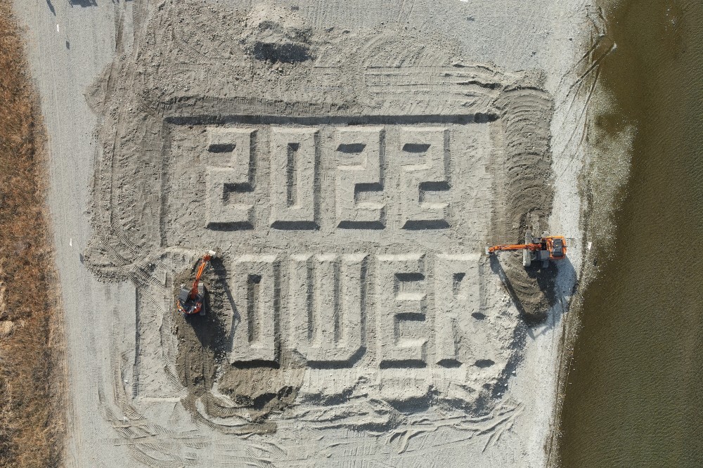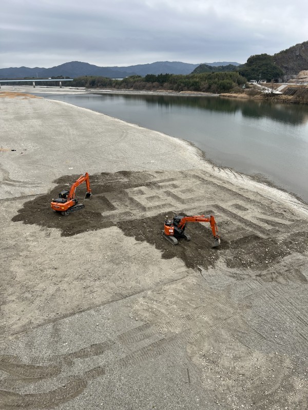 この度、高知河川国道事務所様のご協力のもと、いの町八田の仁淀川河川敷に施工しておりました巨大文字『2022POWER』が完成しました。