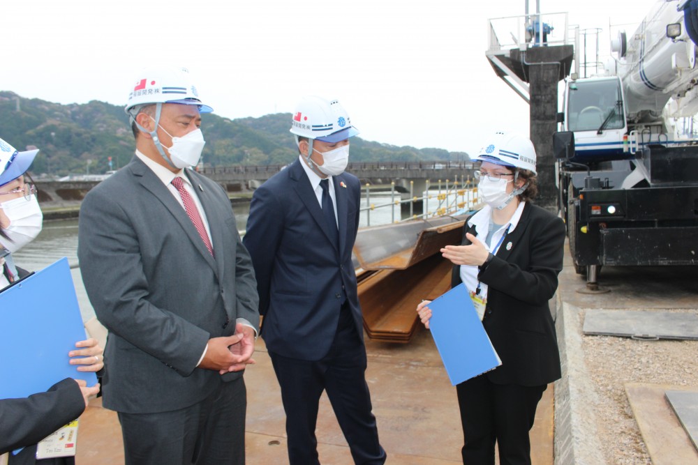 この度、駐日トンガ特命全権大使でありますテヴィタ・スカ・マンギシ大使が来高され、今年1月に発生したトンガ沖海底火山噴火に伴う津波・火山灰被害について高知県主催の義援金贈呈式に臨み、その後当社へ来社されトンガ王国と高知県における防災・減災工事についてディスカッションを行い、当社JVの現場を視察をされました。