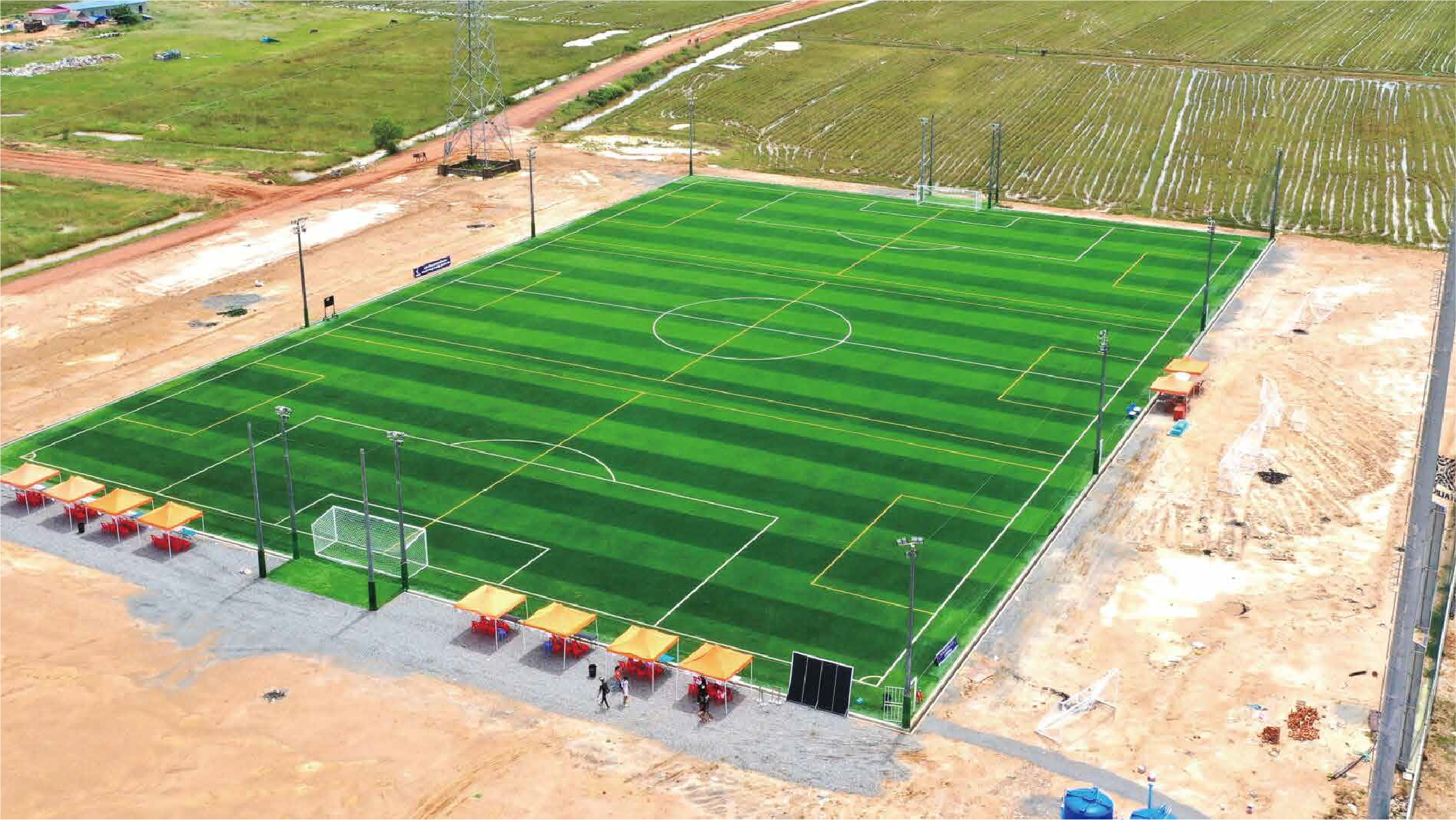 一つ目は、今年の2月から動き出し、9月に無事完成したカンボジア・シェムリアップでのサッカー場建設です。これは建設会社としてではなく、発注者である日本人オーナーのクラブチームの思い描くものを実現するために、プロジェクトマネージャーという立ち位置で関わりました。これは、プレミアリーグに所属するチームのための練習場や地域アカデミー向けの人工芝のサッカー場です。
