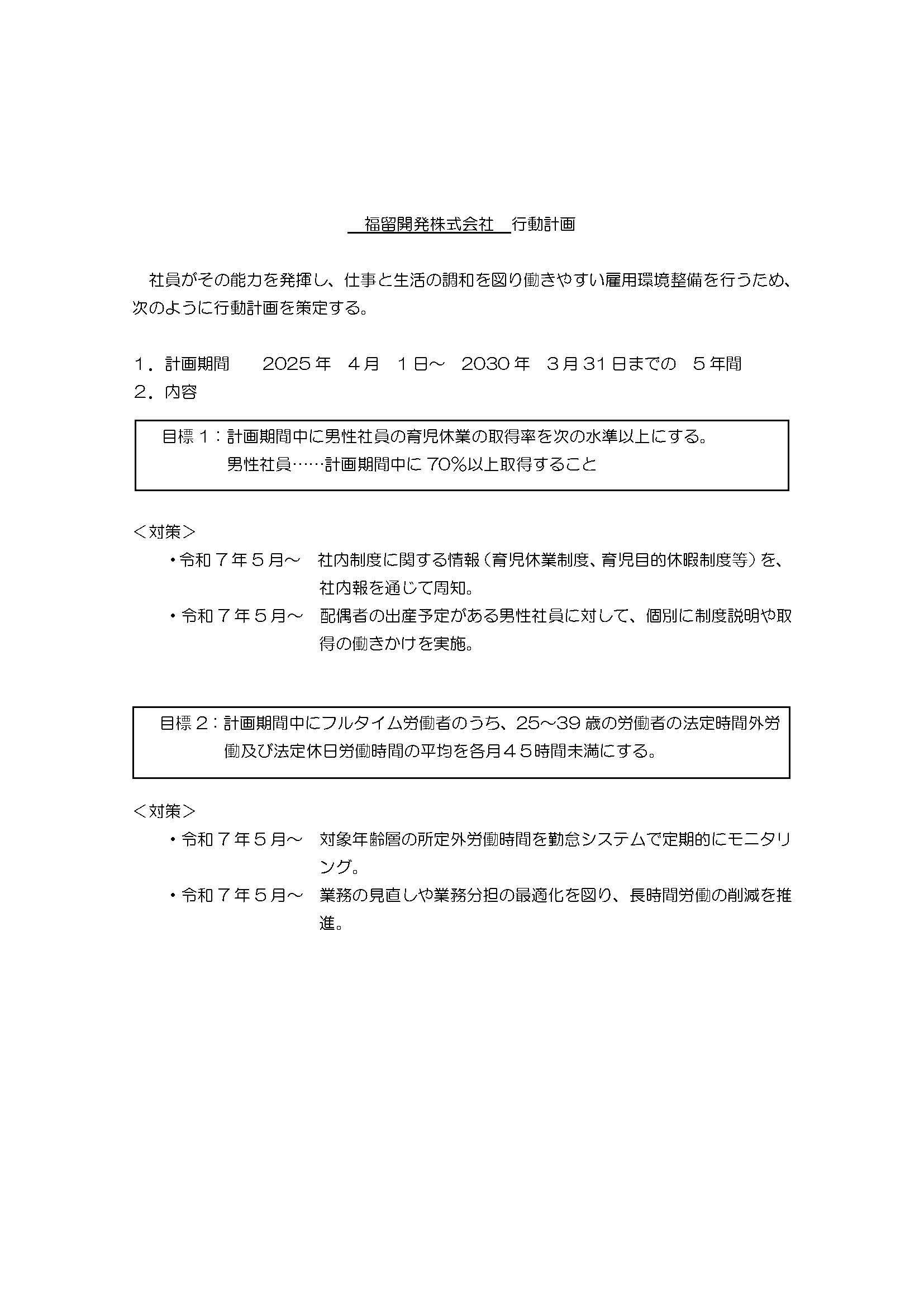 福留開発株式会社は、次世代育成支援対策推進法に基づき、子育て支援に積極的に取り組む企業として、厚生労働大臣より「くるみん認定」を取得しました。